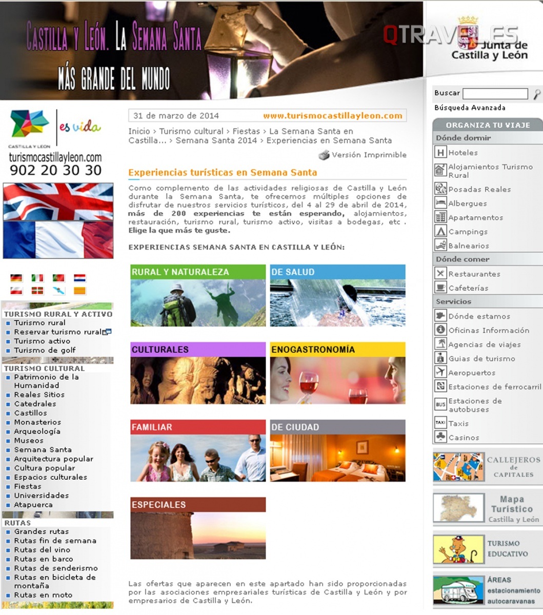 Con el objetivo de adaptar las fiestas a los gustos de cada visitante, Castilla y León lanza más de 200 productos turísticos en colaboración con los empresarios del sector, denominados ‘Experiencias Turísticas en Semana Santa’, que estarán vigentes del 4 al 29 de Abril y que se dividirán en diferentes categorías: ‘Rural y naturaleza’, ‘Salud’, ‘Culturales’, ‘Enogastronomía’, ‘Familiar’, ‘De ciudad’ y ‘Especiales’. Todas ellas, alojadas en www.turismocastillayleon.com y www.castillayleonesvida.com.