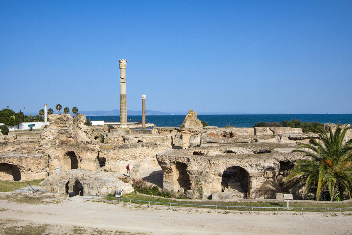 Declarado en 1979 Patrimonio de la Humanidad por la UNESCO, lo que se conserva de la Cartago púnica es bien poco, de hecho, casi todo es romano, a pesar de ello descendiendo de la colina de Birsa hacia la costa con intención de visitar las imponentes ruinas de las Termas de Antonino, pasamos por la necrópolis púnica en la que se encuentran numerosas hornacinas funerarias de pequeño tamaño dedicadas a niños. Llegados a las termas no podemos dejar de quedar admirados por las dimensiones de este colosal edificio. Las termas están situadas en el extremo sureste del recinto arqueológico de Cartago, en la parte inferior de la colina actual de Bordj Djedid.