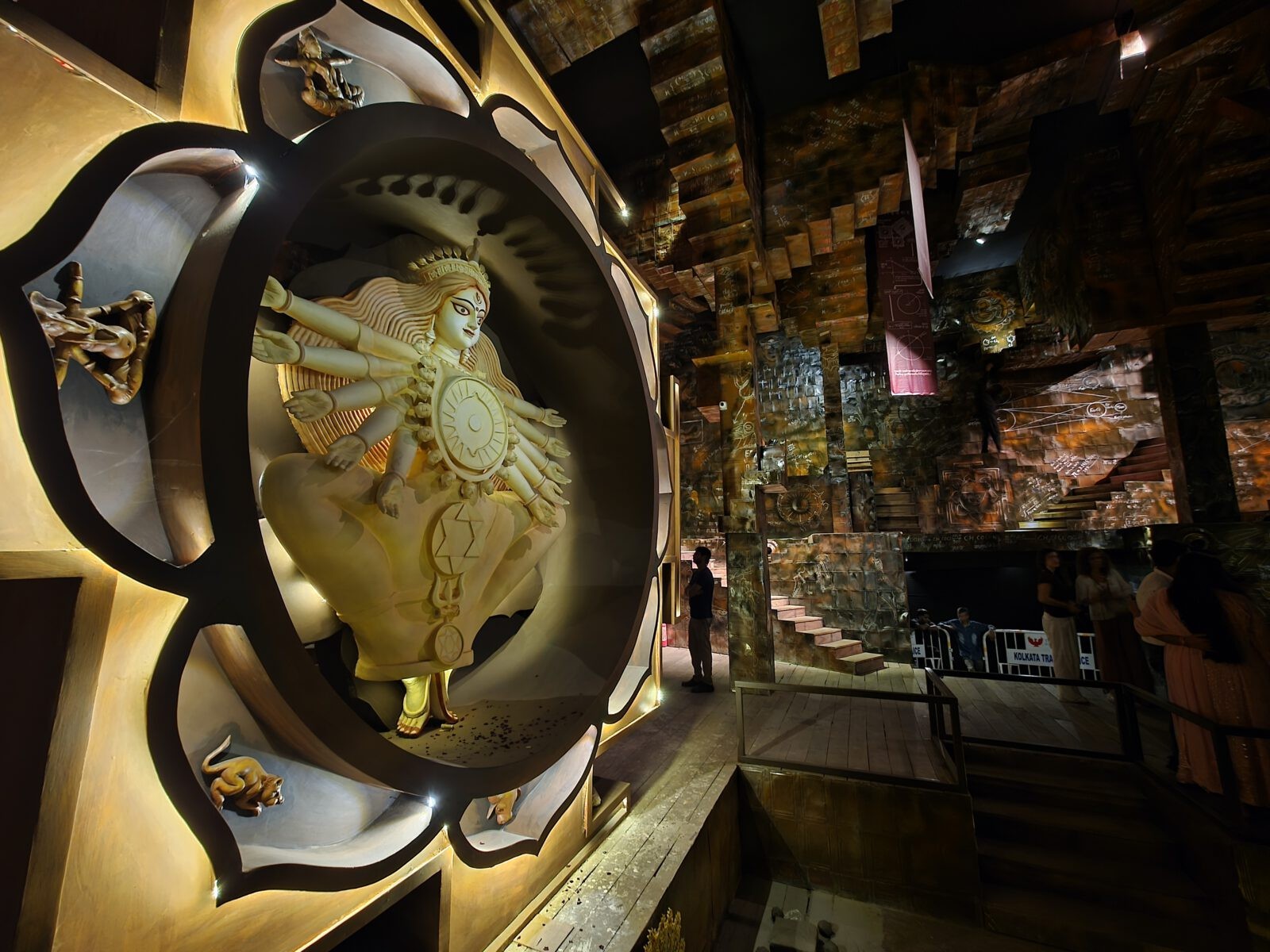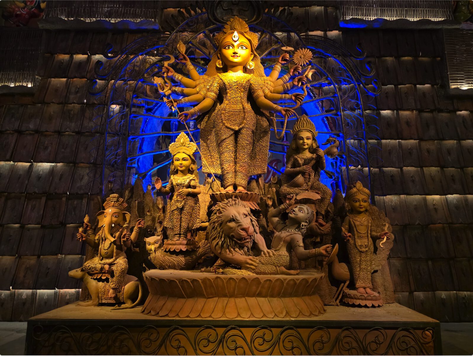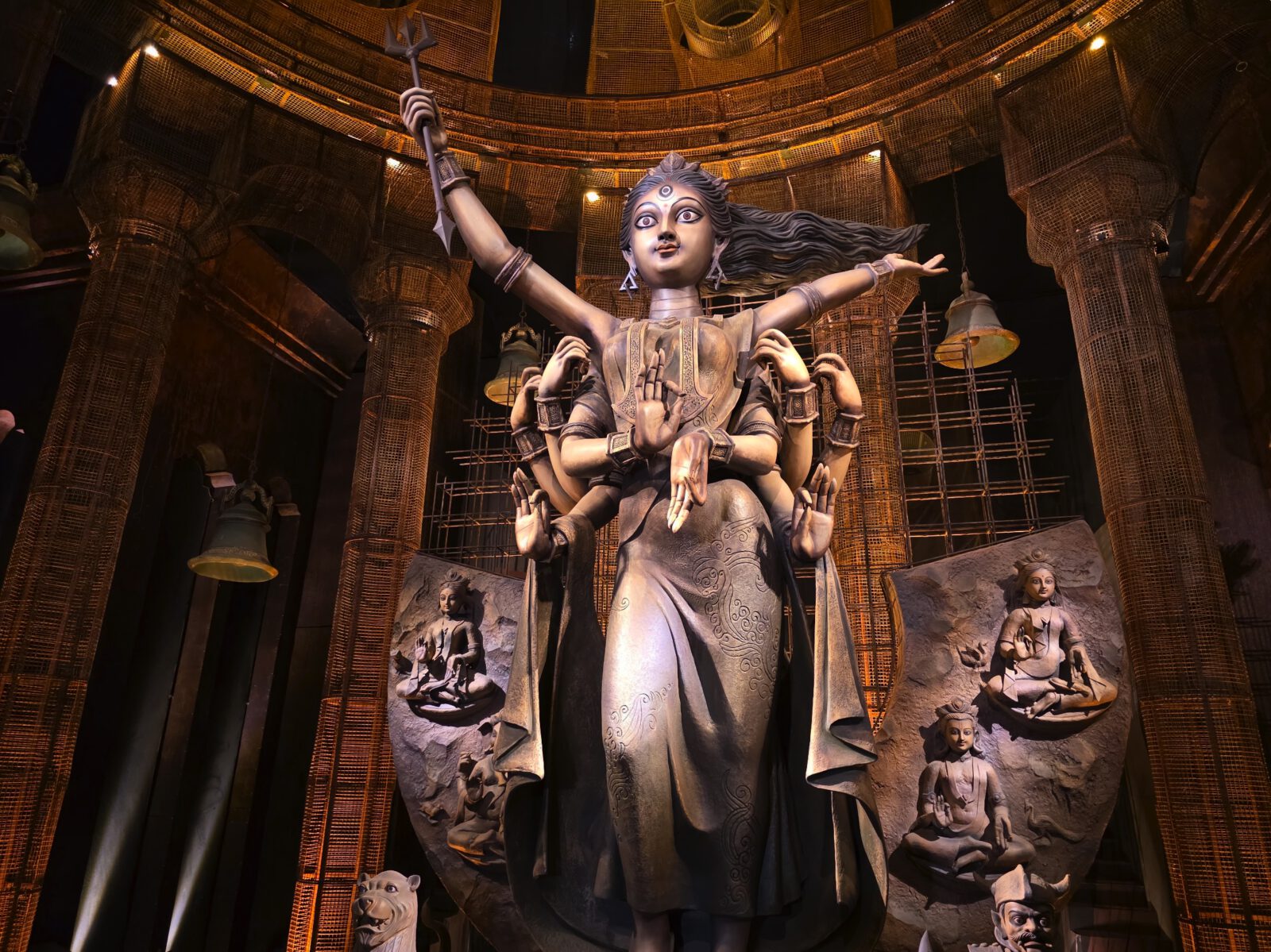 Durga Puja es una festividad hindú que rinde homenaje a la diosa Durga, símbolo de poder femenino que vence al demonio Mahishasura. Pero en Calcuta, este culto se convierte en un fenómeno colectivo: cientos de barrios levantan pandals (estructuras efímeras) para mostrar sus esculturas de Durga y acoger rituales, espectáculos culturales y muestras artísticas.