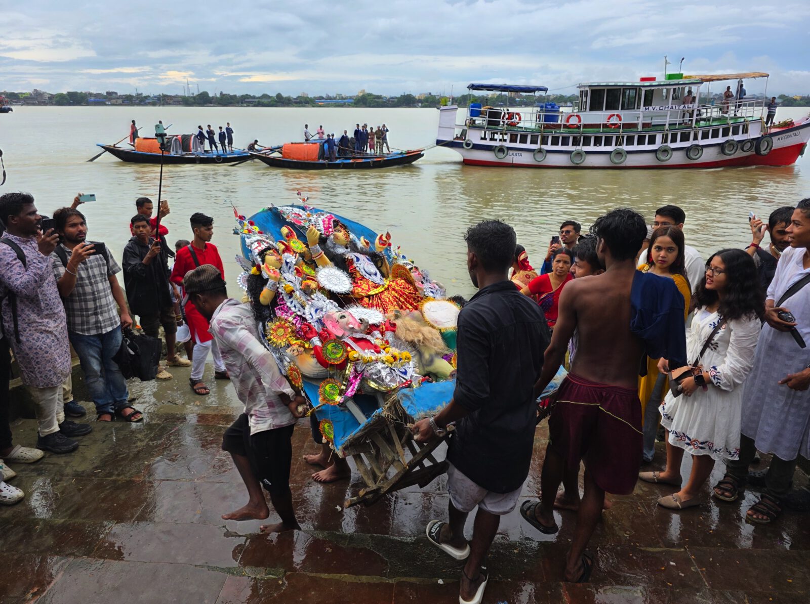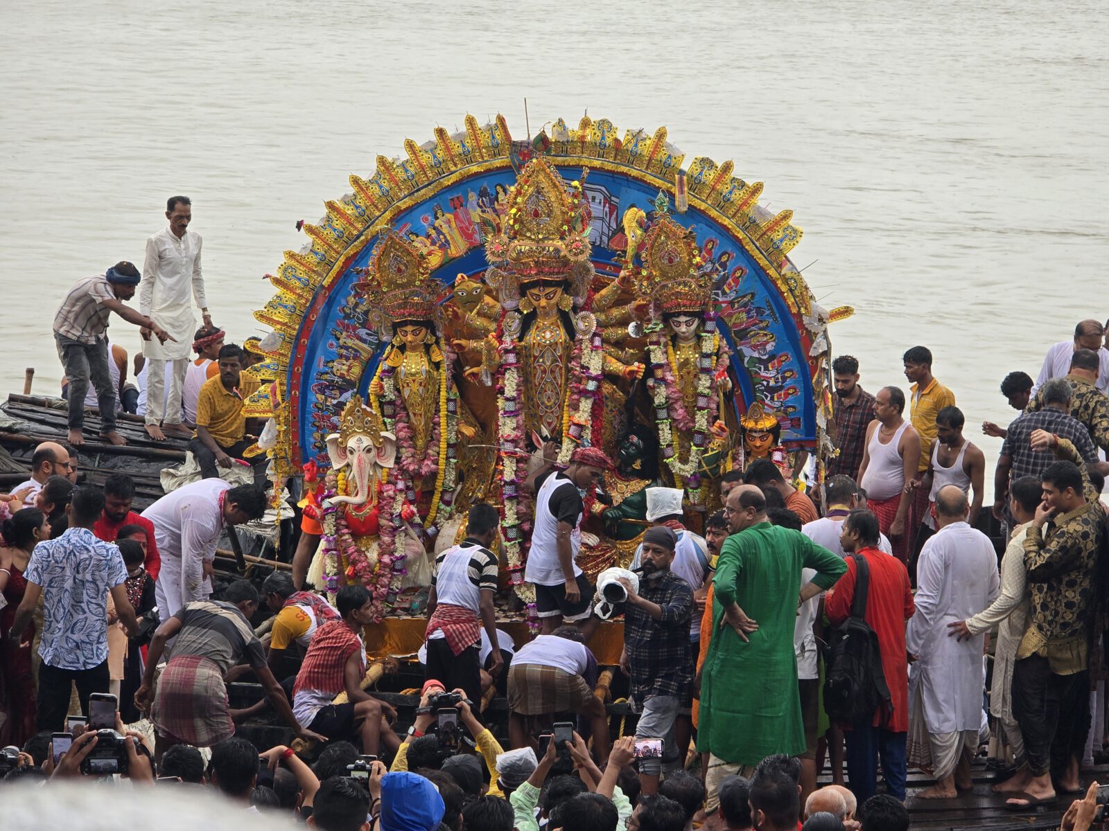 Se ha contabilizado este año que entre Dashami y los últimos días del festival se han sumergido más de 5.200 estatuas de Durga en Calcuta, en decenas de ghats (escalinatas al río). Los principales puntos de inmersión como Babughat manejan centenares de esculturas cada hora. La municipalidad coordina operaciones con policía fluvial, equipos de rescate y limpieza para asegurar que el ritual fluya con orden y seguridad.