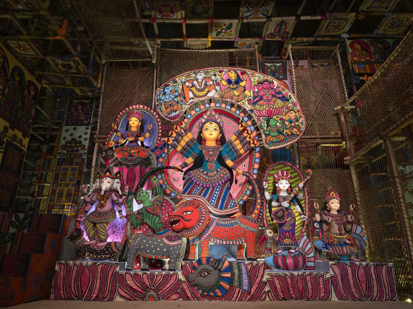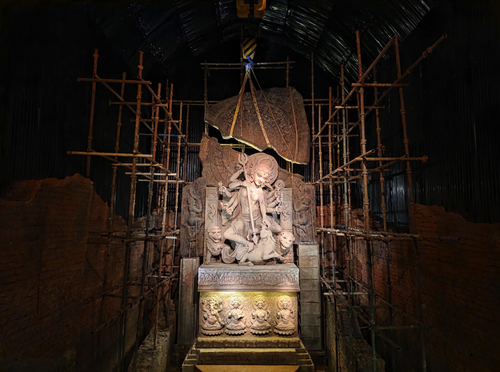 La escultura de la diosa, así como las de sus hijos (Ganesha, Kartikeya, Saraswati, Lakshmi), se elaboran meticulosamente en Kumartuli, el barrio artesanal de Calcuta famoso por sus talleres de imágenes divinas. Allí los artesanos usan arcilla, paja, cañas y moldes tradicionales. Las figuras se modelan, se visten de tela, se pintan los ojos a mano y se adornan con detalles metálicos o vegetales. Luego se trasladan al pandal para integrarse en la escenografía.