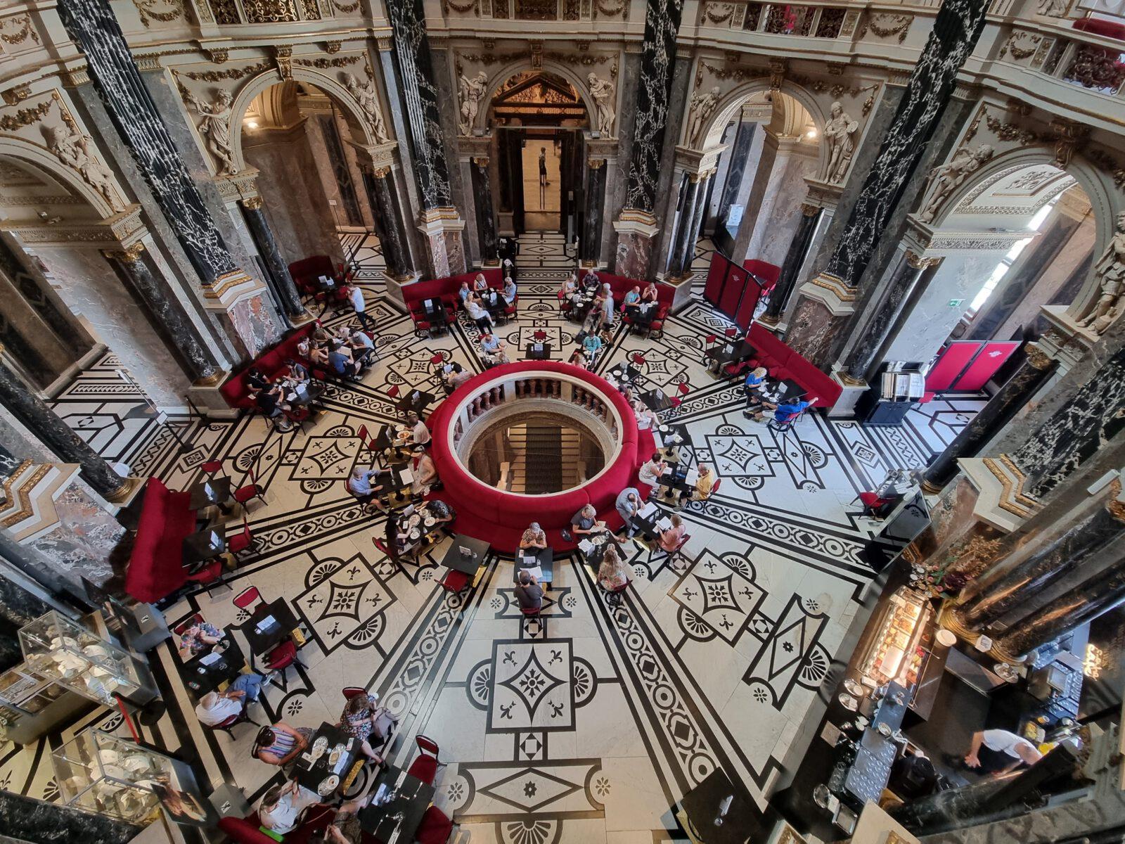Y entonces llega la sorpresa. Al alcanzar el primer piso, justo bajo la cúpula, aparece una cafetería que no rompe la estética del edificio, sino que la prolonga. Este es, probablemente, uno de los cafés más especiales que ver en Viena.