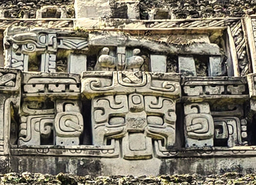 Mientras te preparas para el ascenso, hay un detalle artístico que capturará tu mirada de forma inevitable: los frisos de estuco en el cuerpo central de El Castillo.