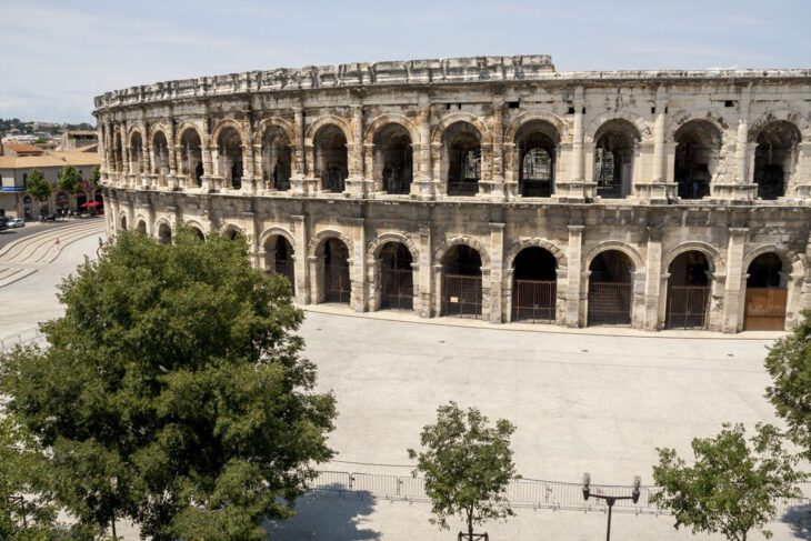 Construido a finales del siglo I después de Cristo, el anfiteatro (o circo romano) de Nîmes se encuentra entre los más grandes de la Galia romana. Mide aproximadamente 133 metros de largo y 101 metros de ancho. Su fachada, de 21 m de altura, está compuesta por dos niveles de 60 arcos cada uno. En el interior, más de 20.000 espectadores podían asistir a los combates de animales y de gladiadores. Un sistema de pasillos y escaleras (Vomitorium)permitía que todos pudieran abandonar rápidamente su asiento. Dispuestos según su clase social, los espectadores estaban protegidos del sol por un vélum sostenido por cuerdas enganchadas en astas.