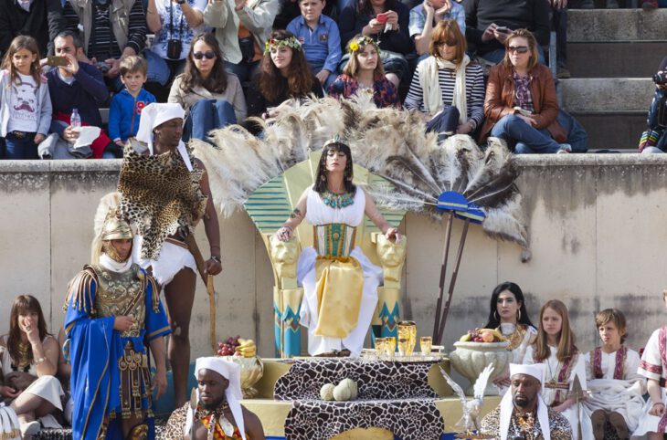 El pasado año las Arenas de Nimes, visitó su anfiteatro para dedicar su espectáculo a Cleopatra y la batalla de Actium. Con una espectacular puesta en escena, la acción discurre ante la mirada del Emperador Adriano sentado en el palco de honor. Después de las carreras ecuestres y las luchas de gladiadores comienza la recreación de la batalla naval que se desarrolló entre las fuerzas navales de Cleopatra y Marco Antonio contra las de Octavio César en la embocadura del golfo de Ambracia, y culminó con la derrota de la armada egipcia y la posterior batalla de Alejandría entre ambos contendientes.