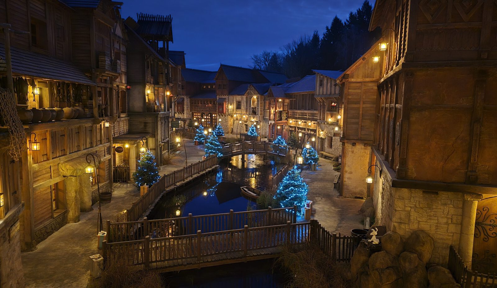 El complejo cuenta con tres hoteles tematizados. Durante el año ya tienen su encanto, pero en Navidad se transforman aún más: guirnaldas, árboles, luces cálidas, detalles decorativos en las habitaciones y zonas comunes pensadas para prolongar la experiencia.